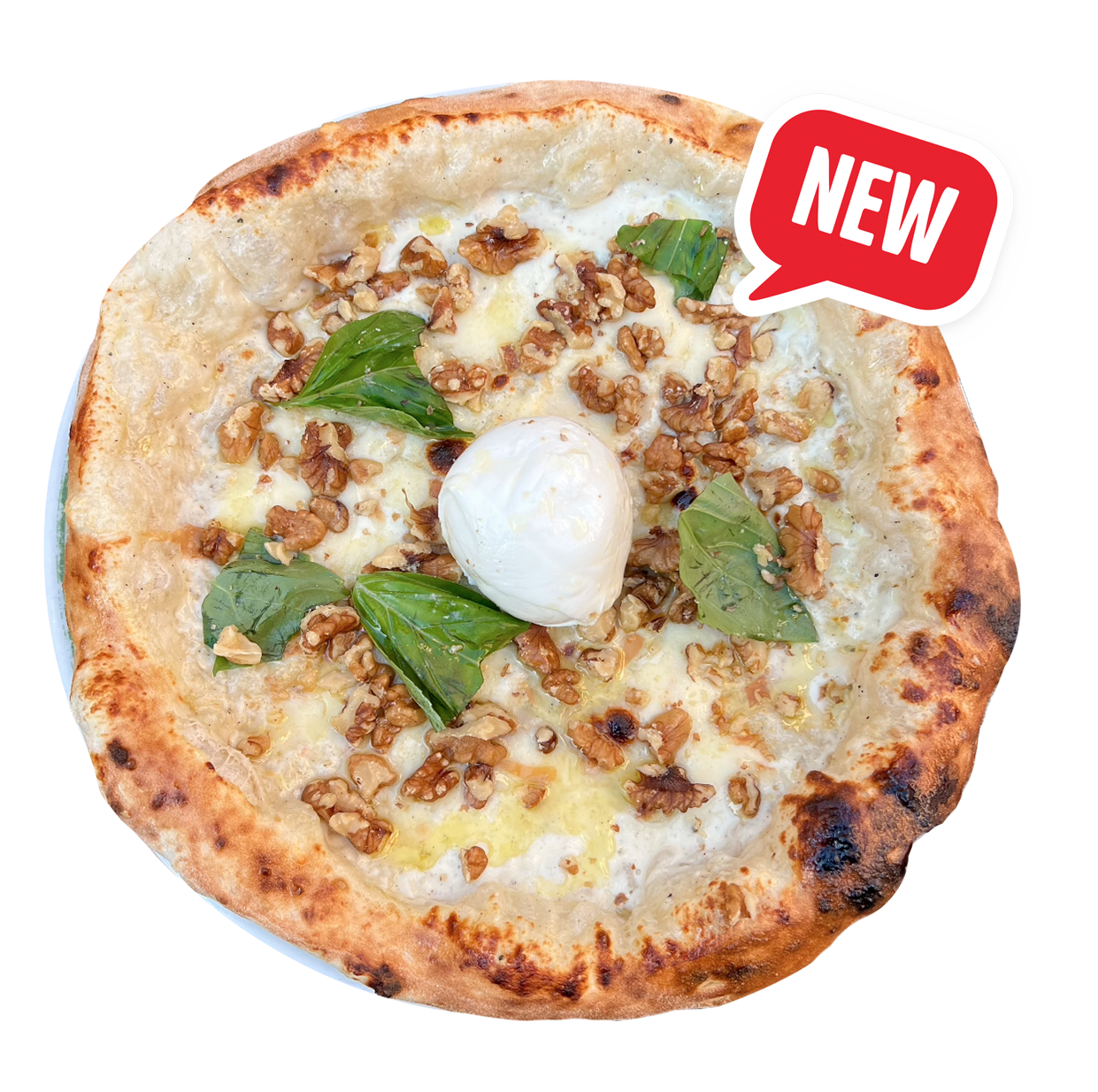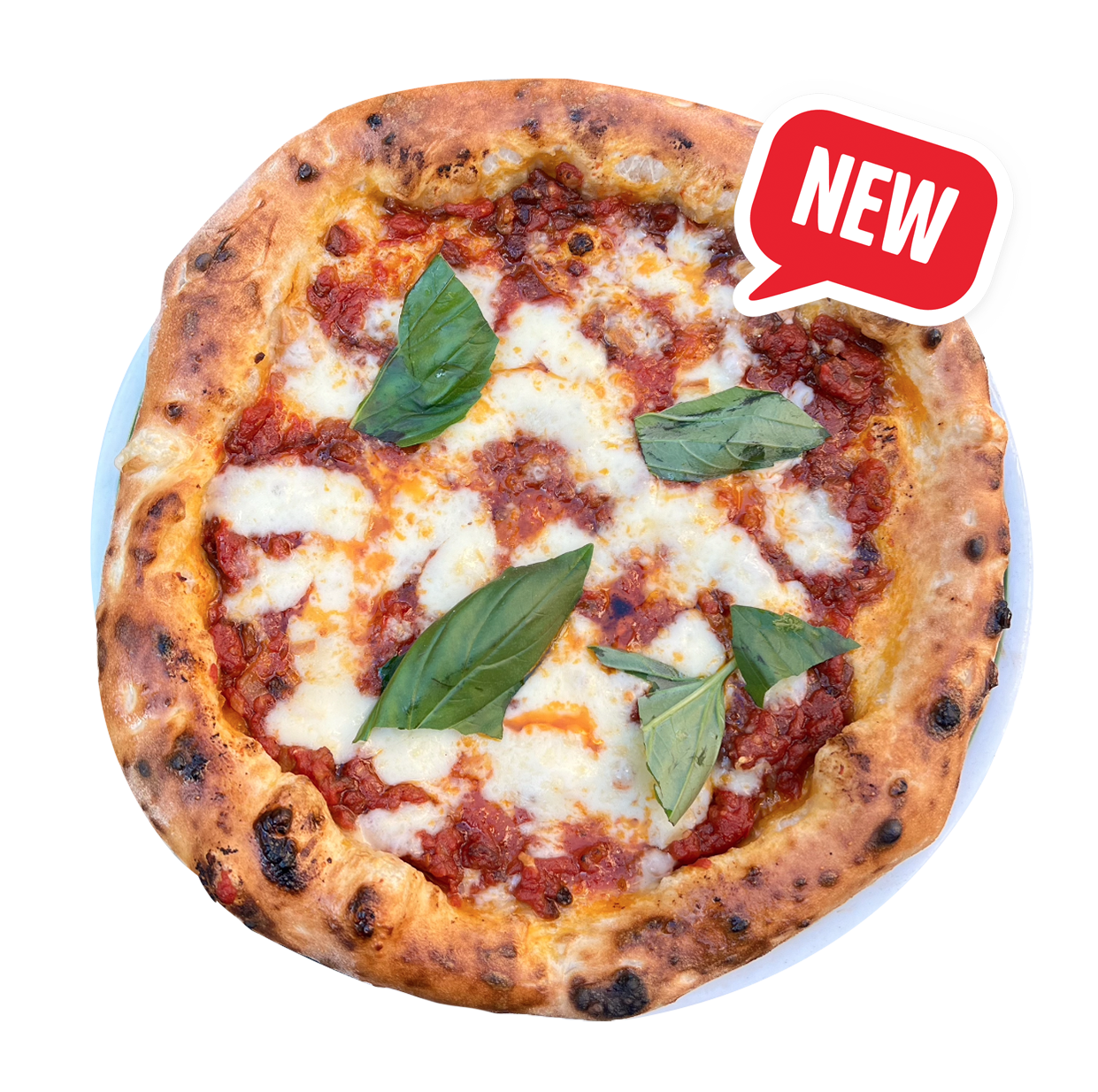 Velo di pomodoro San Marzano DOP , pomodorino del piennolo del Vesuvio DOP, spianata calabra piccante, n’duja di Spilinga , fiordilatte dei Monti, grana stag. 24 mesi, olio evo, basilico fresco dell’orto