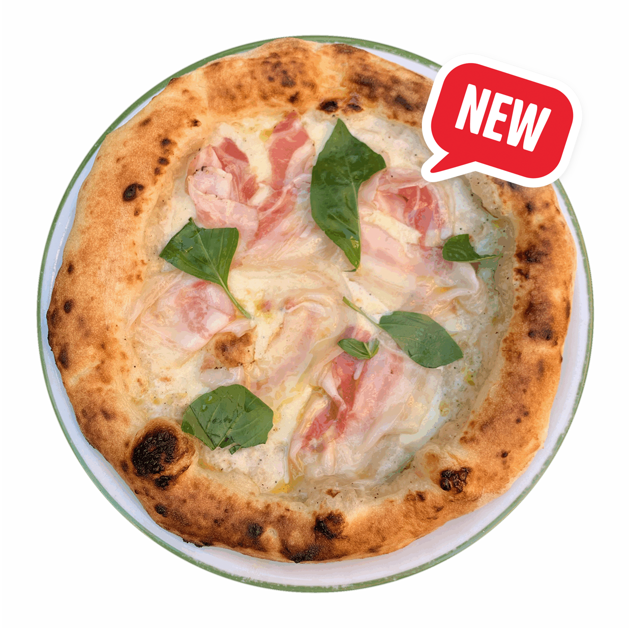 Pizza 3 gusti dedicata alle 3 città dei miei locali, salsiccia di maialino nero, friarielli napoletani spadellati con aglio, olio e peperoncino, amatriciana fatta con ragù, guanciale, pecorino romano e peperoncino, fiordilatte, rucola selvatica, bresaola e scaglie di grana