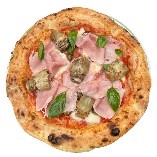 Pomodoro San Marzano DOP, Fiordilatte dei Monti, prosciutto cotto a vapore “Renzini”, salamino di nero casertano, carciofi grigliati e speziati, olive nere taggiasche, grana, olio evo, basilico fresco dell’orto