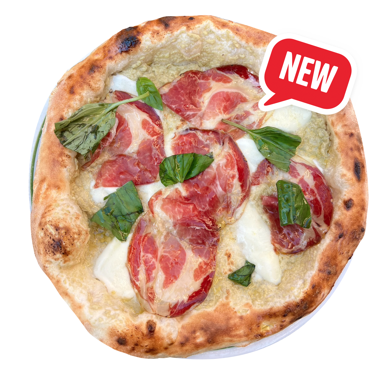 Crema di carciofi homemade, mozzarella di Bufala DOP, capocollo di Martina Franca presidio Slow Food, grana stag. 24 mesi, provola affumicata, olio evo, basilico fresco dell’orto