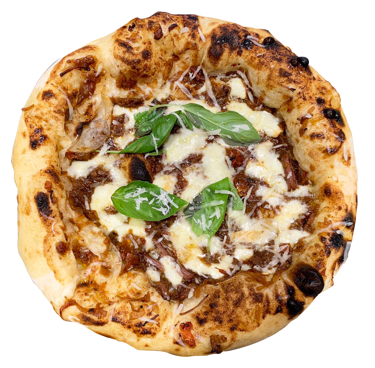 Pizza fritta e poi asciugata al forno con base di ragù napoletano, provola affumicata dei Monti, polpettine di scottona e basilico fresco
