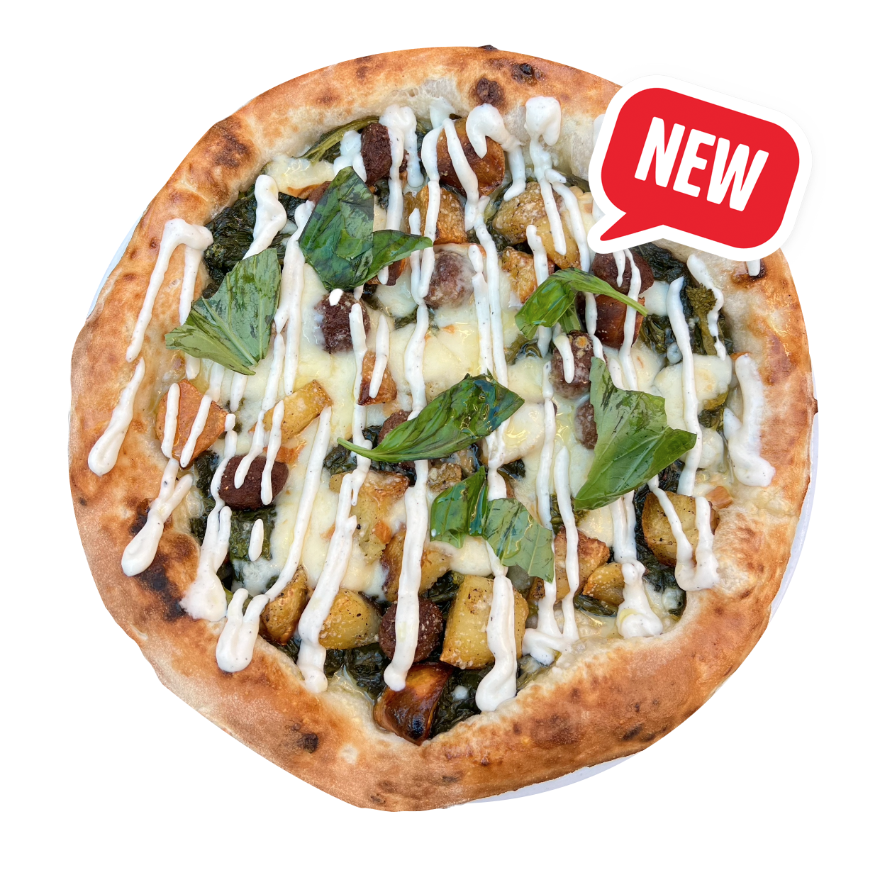 Base di provola affumicata dei Monti, salsiccia di nero casertano a punta di coltello, patate al forno speziate, olive nere taggiasche, grana, olio evo, basilico fresco dell’orto